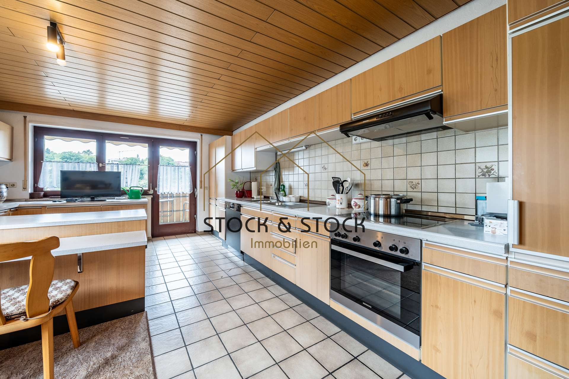 Im Obergeschoss befindet sich das Herzstück der zweiten Wohneinheit: Eine helle und weitläufige Küche, die ausreichend Platz für Stauraum und Sitzgelegenheiten bietet.