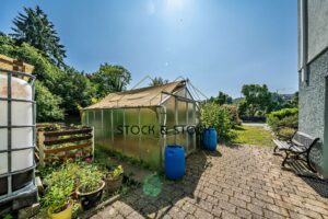 Ein weiteres Highlight der Immobilie ist der schöne grüne Garten, der mit seiner Rasenfläche und dem Gewächshaus zum Gärtnern, Spielen und Verweilen einlädt.