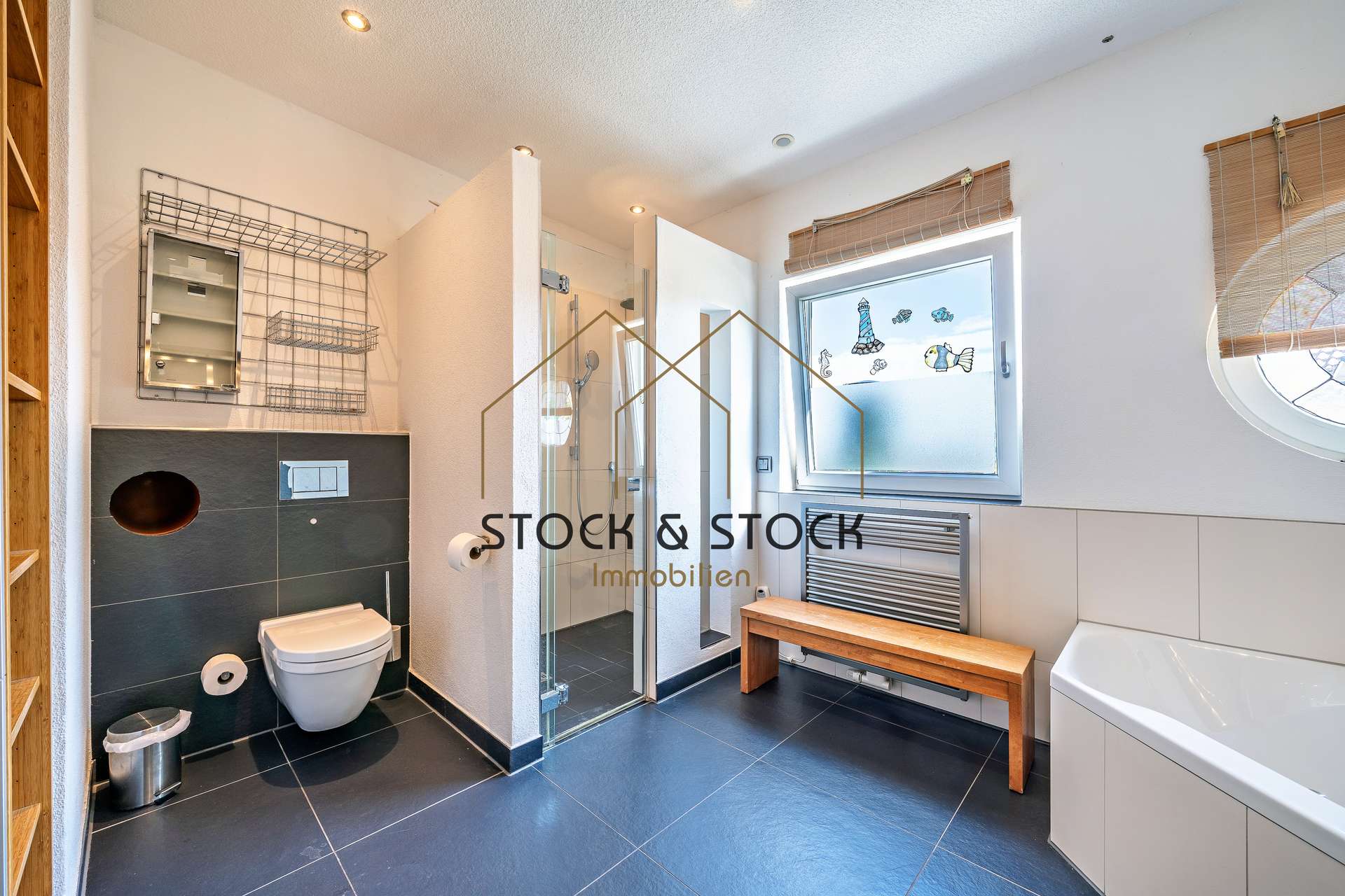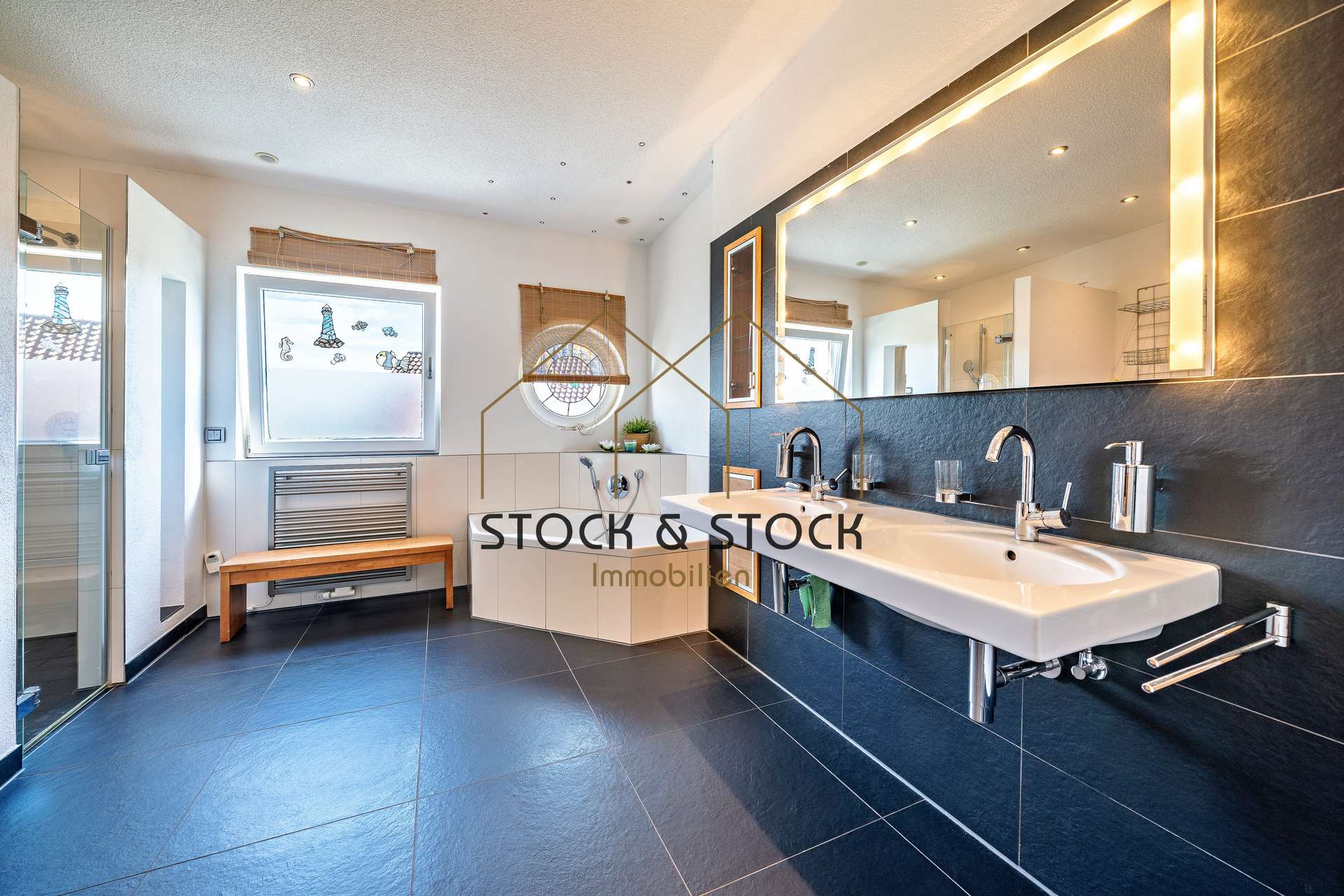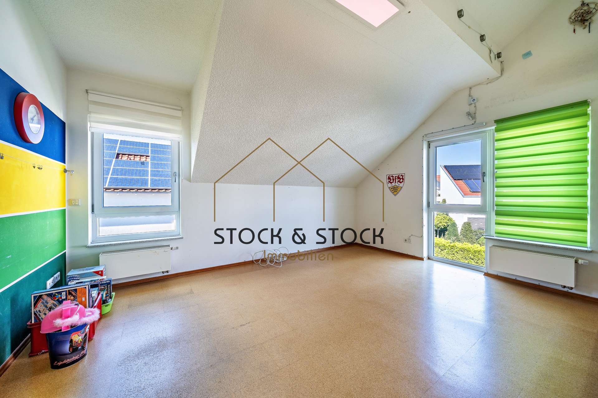 Abgerundet wird das Erdgeschoss von einem freundlichen Zimmer, welches sowohl als Büro oder als Gästezimmer dienen kann, einem Tageslichtbad mit Dusche und WC sowie einem Hauswirtschaftsraum mit integriertem Wäscheabwurf, der zugleich als Schleusenraum zur hellen Doppelgarage dient.