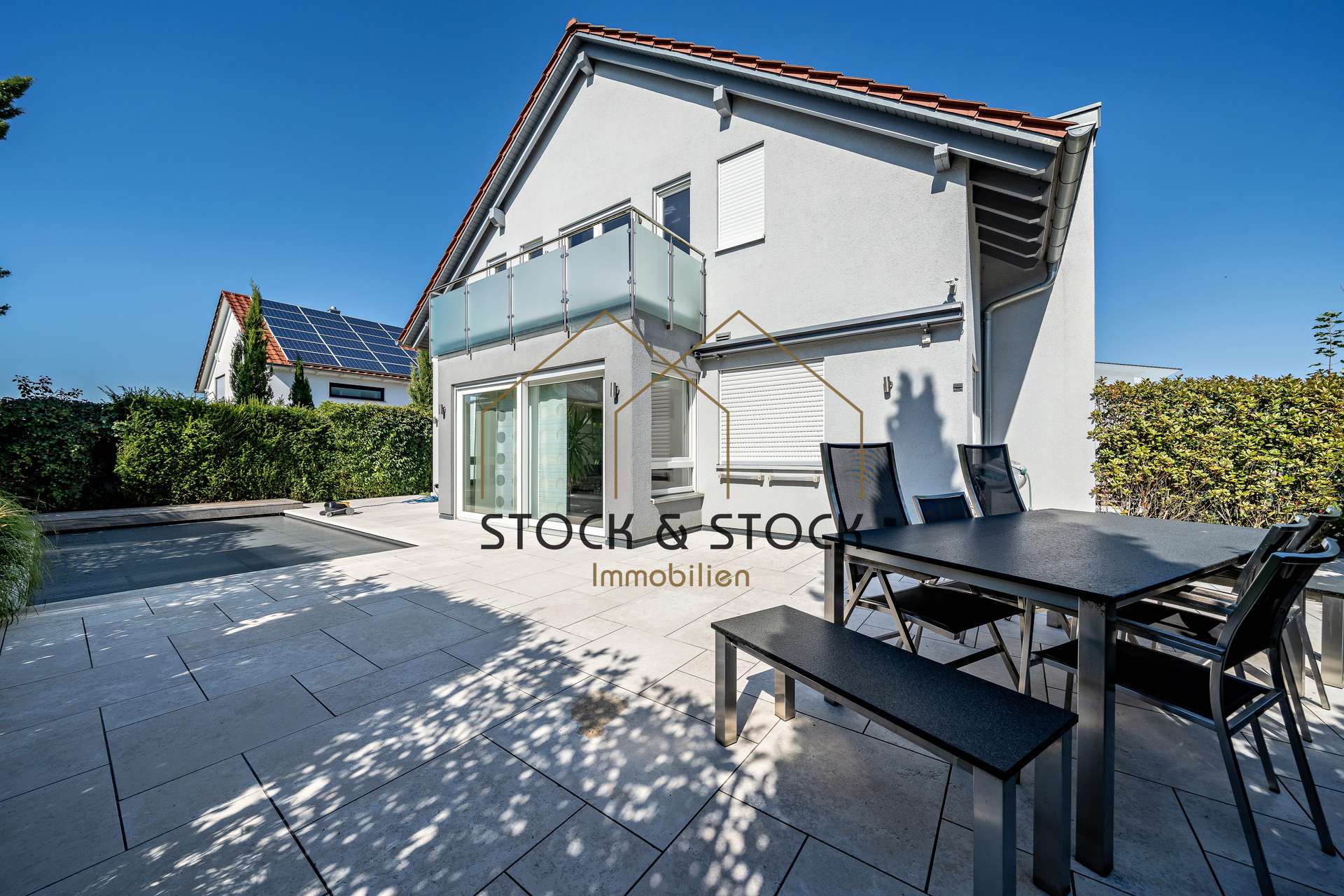 Ein Highlight dieser modernen Immobilie ist der sichtgeschützte Garten mit seiner umlaufenden Terrasse und dem eingelassenen Pool.