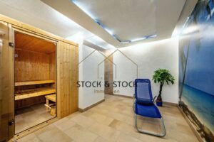 Für zusätzlichen Stauraum sorgt der vorhandene Keller, in dem sich neben der Heizung auch ein großer Lagerraum, ein gut geschnittener Aufenthaltsraum mit eingebauter Pantry, ein Fitnessraum sowie eine Sauna mit Ruheraum und Dusche und WC befindet.