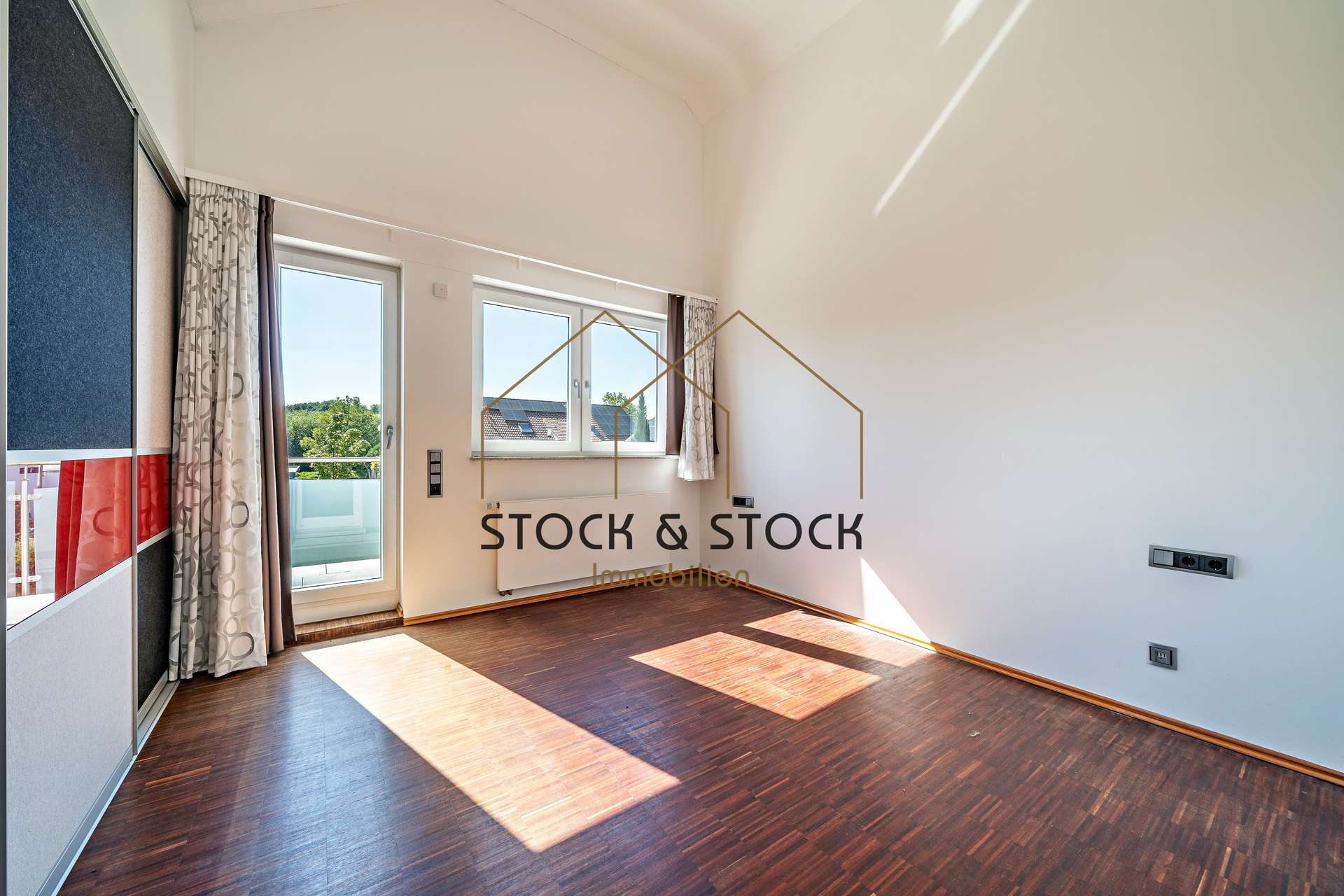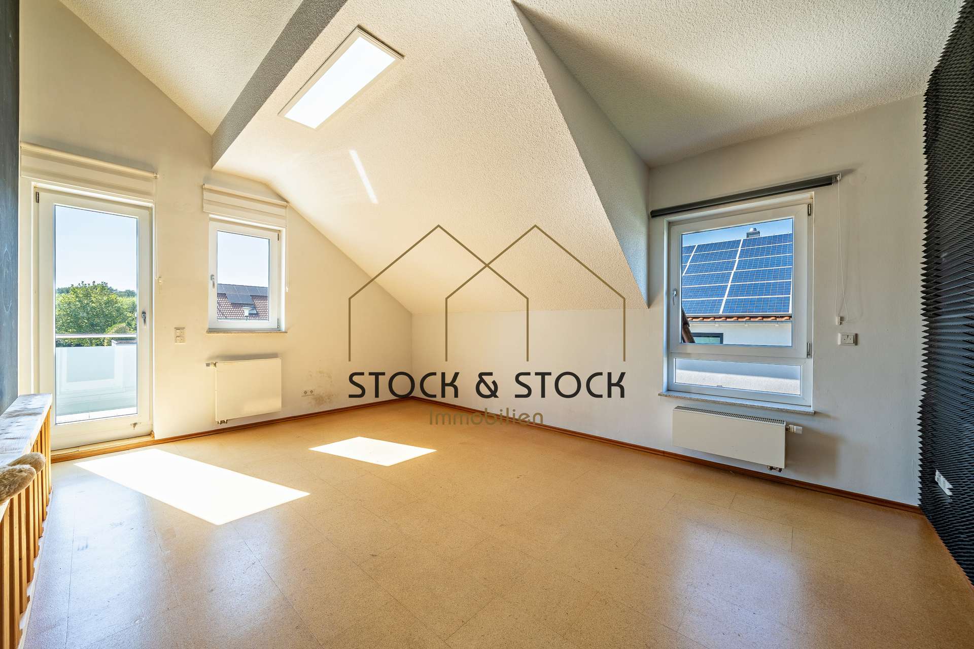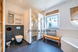 Das ausgebaute Dachgeschoss besteht aus insgesamt vier großzügigen und hellen Schlafzimmern, von denen das Elternschlafzimmer mit einem angrenzenden Ankleideraum ausgestattet ist. Hohe Decken in Kombination mit zahlreichen Fenstern sorgen hier für ein besonders luftiges Wohngefühl. Ein Balkon und ein modernes Tageslichtbad mit Dusche und Eckbadewanne vervollständigen diese Etage.