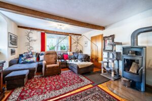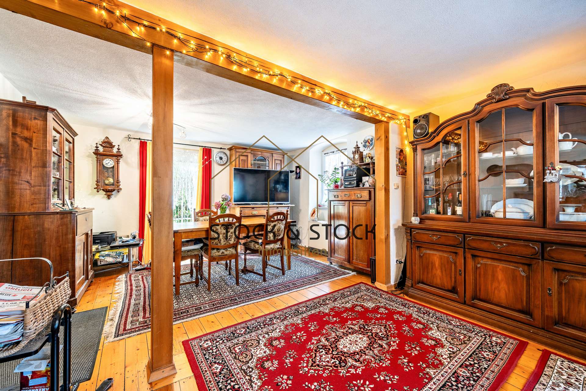 Das Herzstück des Hauses bildet hierbei der weitläufige Wohn-und Essbereich im Erdgeschoss. Hier sorgt die gelungene Kombination aus schönen Holzdielen mit rustikalen Sichtbalken und hellen Wänden für ein warmes und heimeliges Wohngefühl. Der vorhandene Kamin lädt zum gemütlichen Beisammensein mit Familie und Freunden an kühlen Abenden ein.