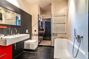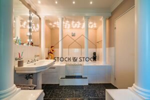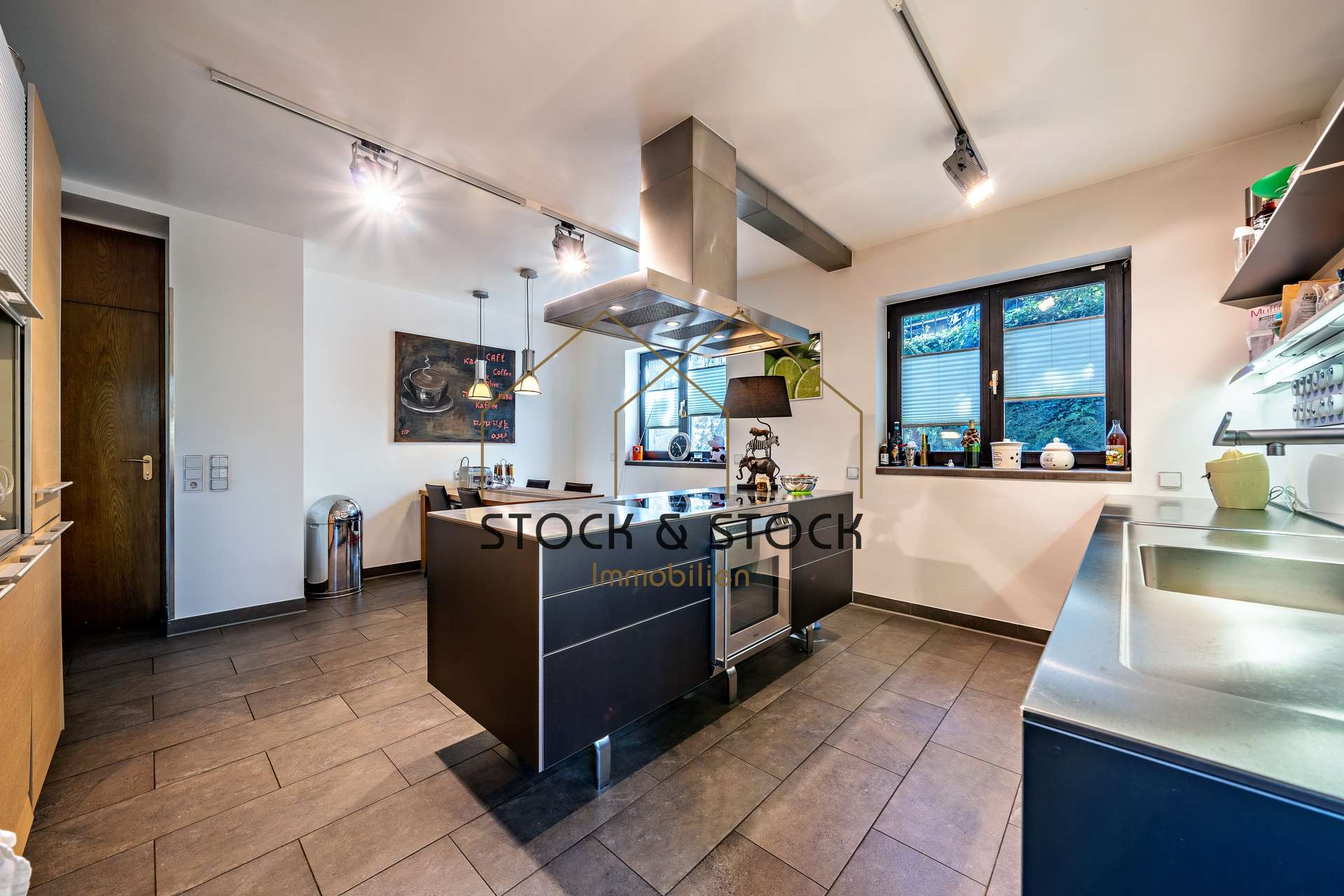 Die großzügige Einbauküche mit eleganter Kochinsel bietet ausreichend Stauraum und Platz zum Kochen und Backen mit Familie und Freunden. Zudem verfügt das Erdgeschoss über ein Schlafzimmer, einen Ankleideraum, einen Hauswirtschaftsraum und ein Badezimmer, das mit seiner säulenumfassten Badewanne und dem an einen Sternenhimmel angelehnten Beleuchtungskonzept ein echter Blickfang ist.