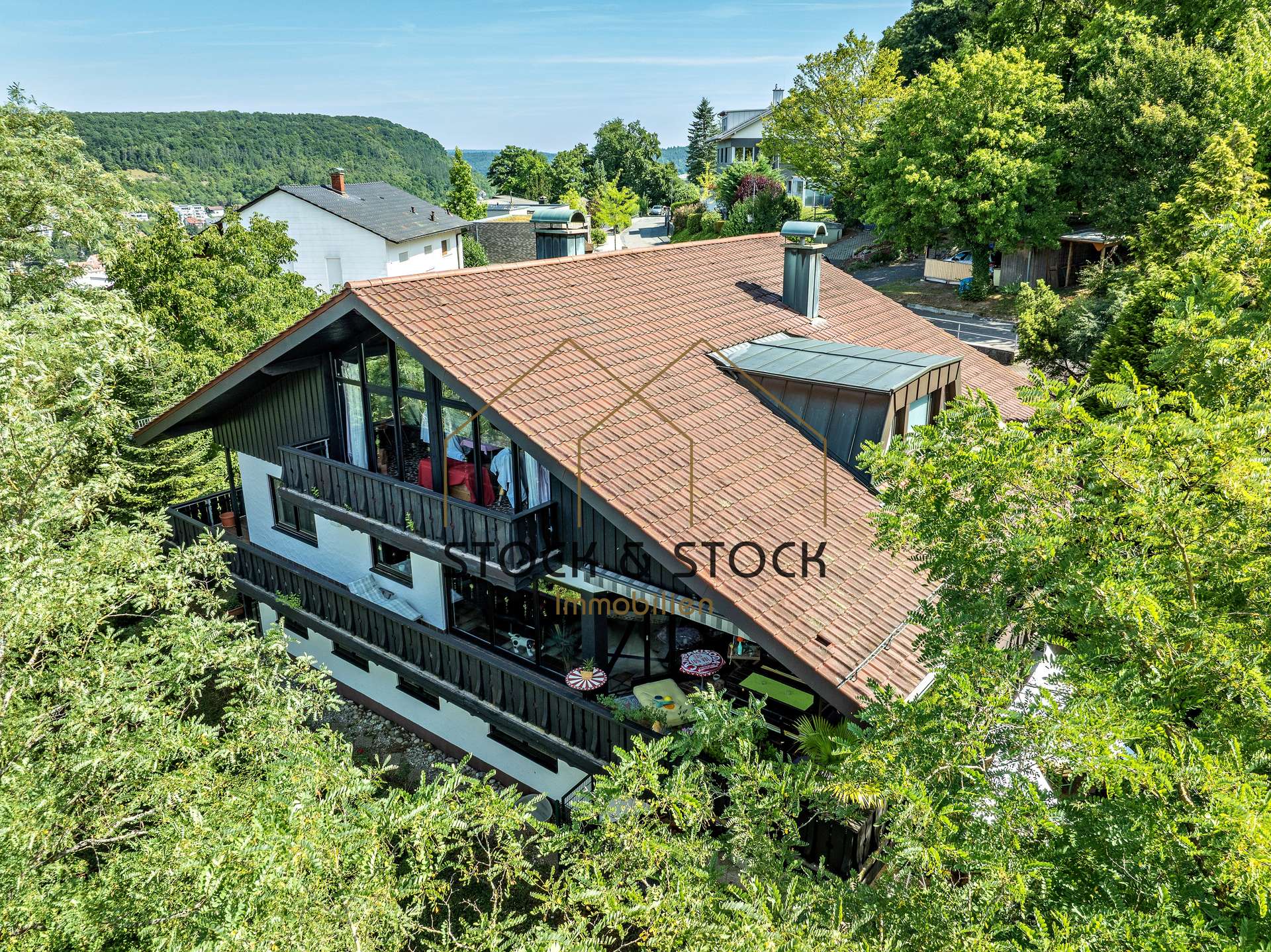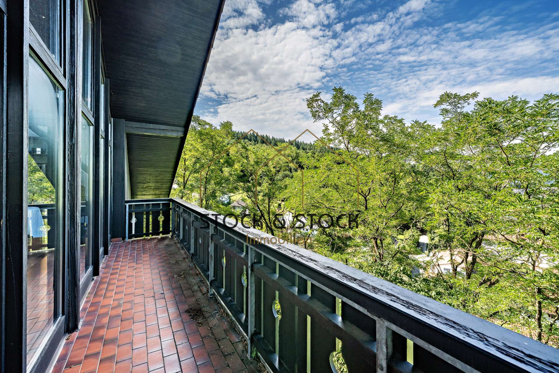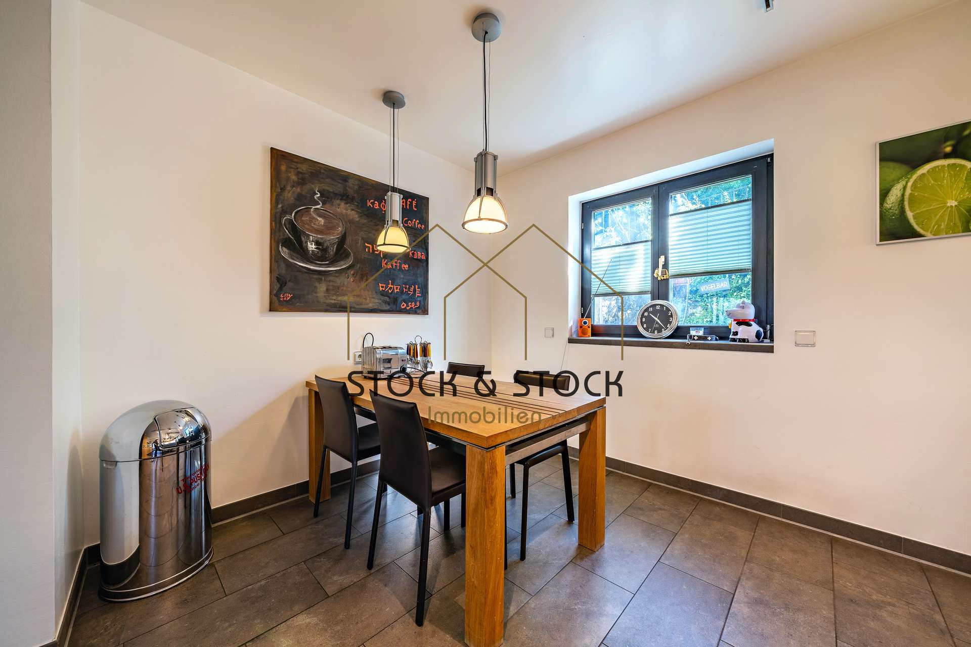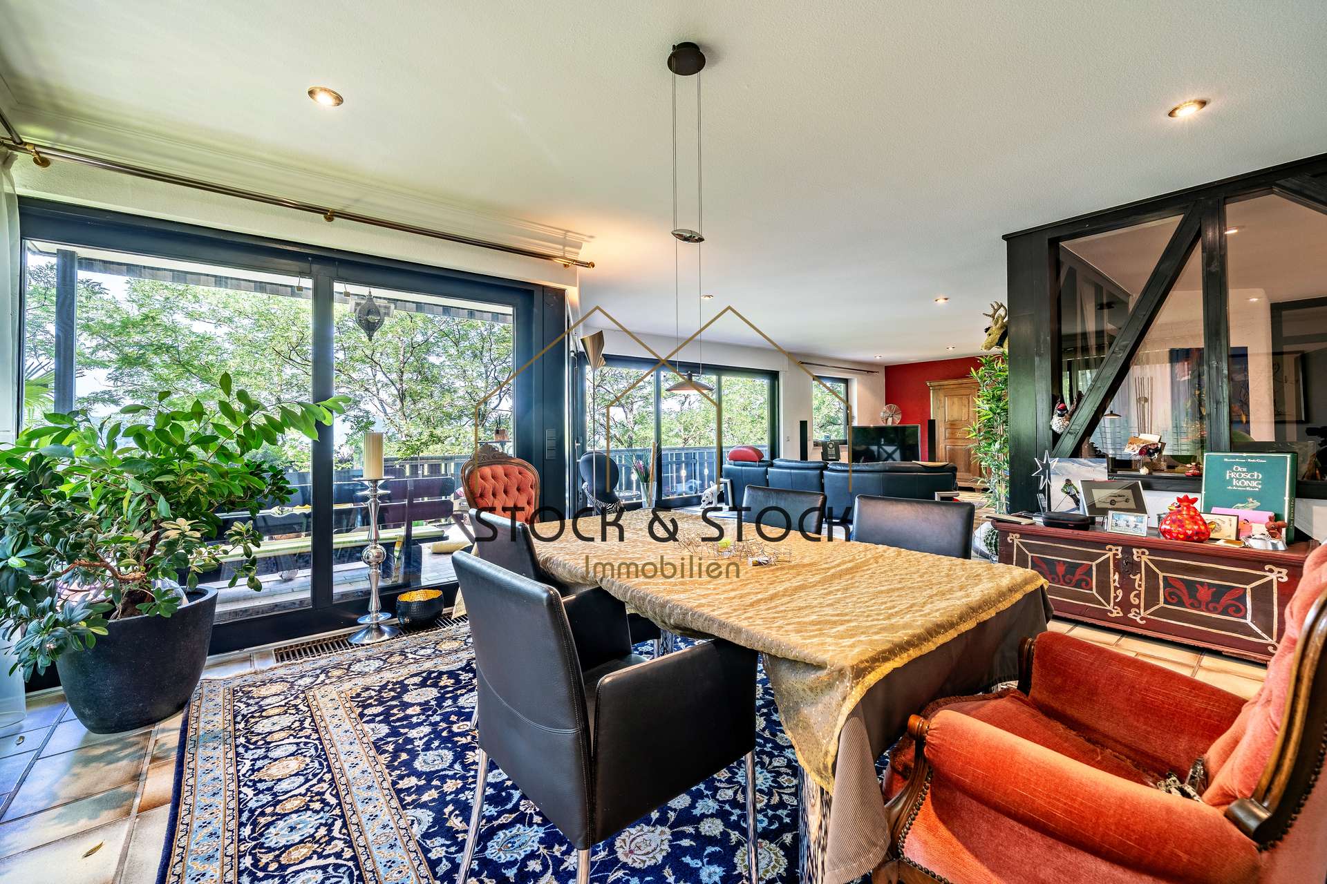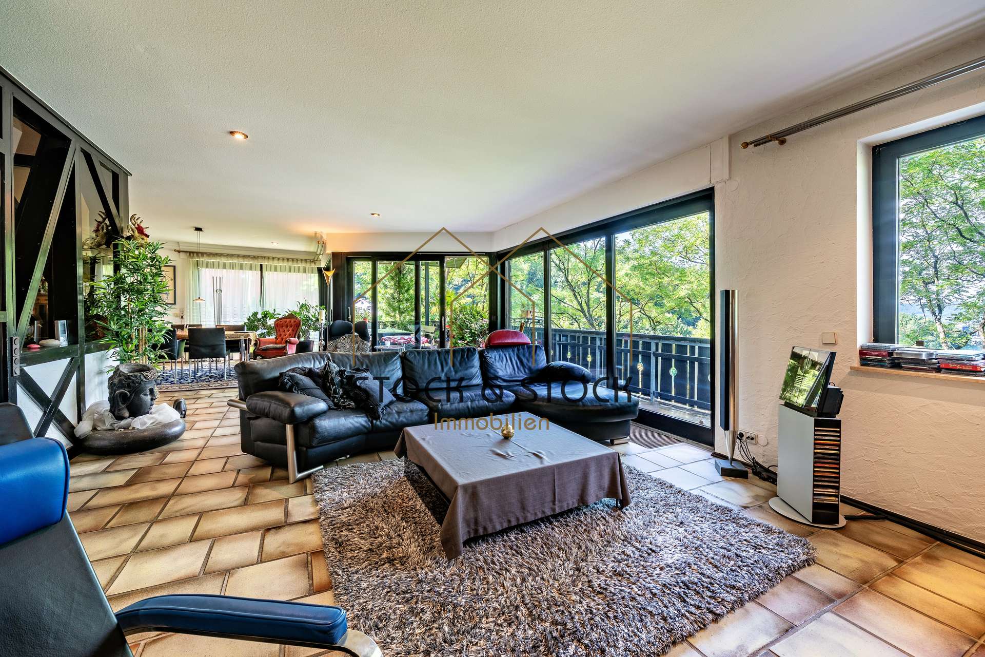 Im Erdgeschoss befindet sich das Herzstück der Immobilie: Der großzügige Wohn- und Essbereich, der mit seiner durchgängigen Panorama Fensterfront beeindruckt und mit dem geschmackvollen Kachelofen für ein ganz besonderes Ambiente sorgt. Auf dem angrenzenden, großen Balkon lassen sich laue Sommerabende mit Blick ins Grüne entspannt genießen.