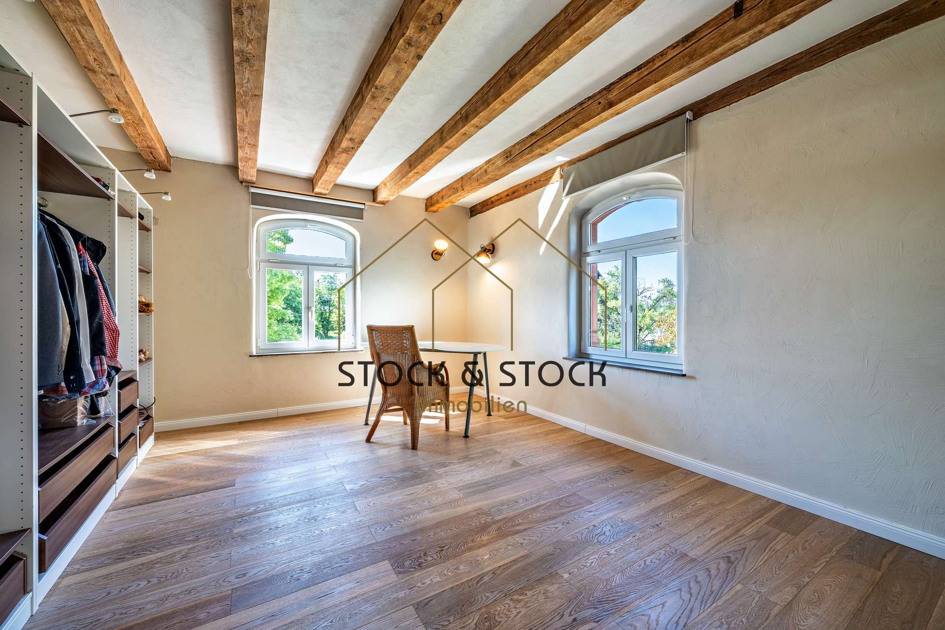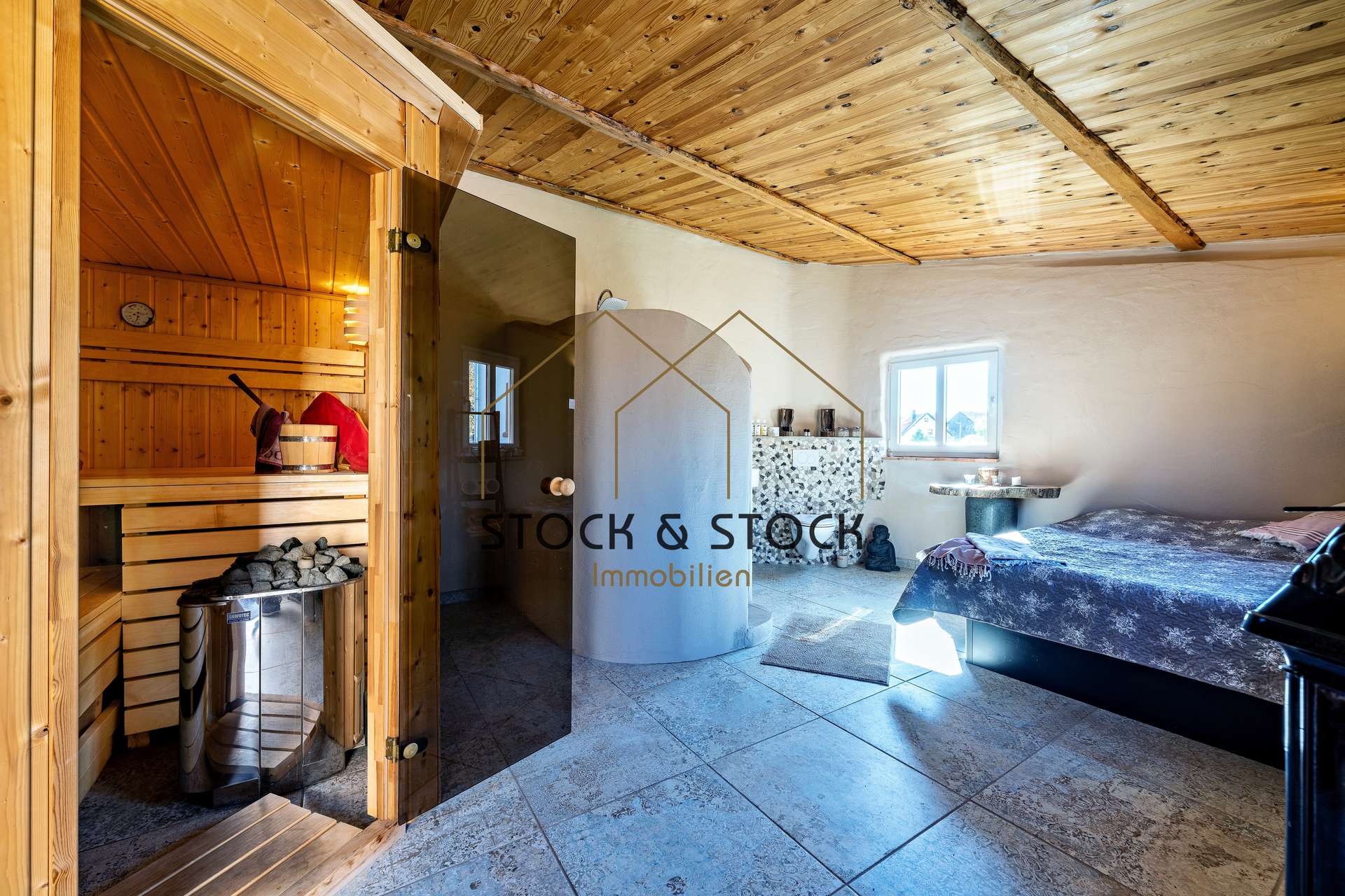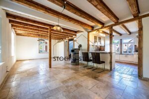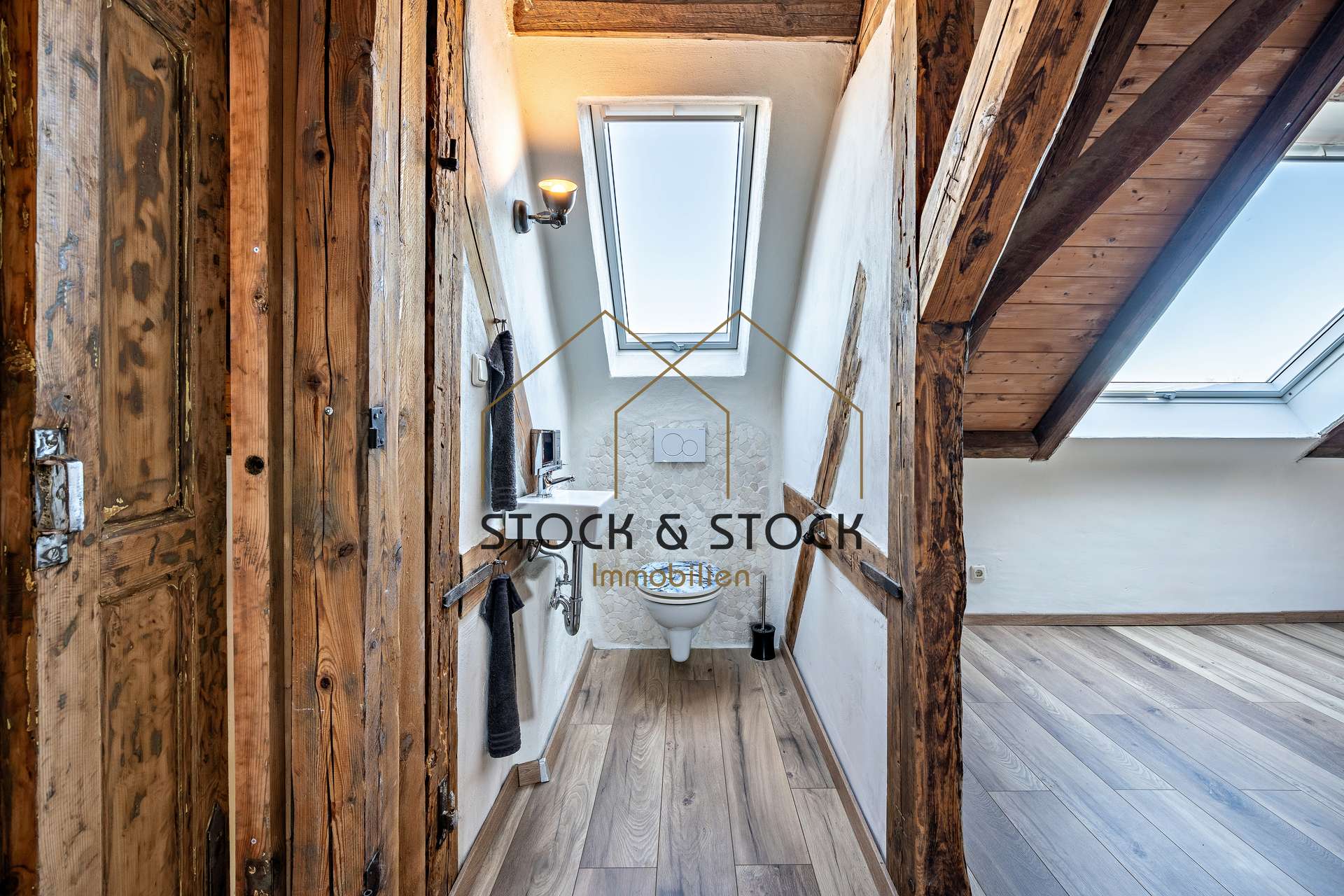 Ein Highlight stellt das komplett ausgebaute Dachgeschoss mit Kamin und Gäste WC dar. Ob als Schlaf,-oder Hobbyzimmer, Wohnzimmer oder Büro – diese beeindruckenden Räumlichkeiten mit ihren rustikalen Balken und zahlreichen Fenstern bieten ausreichend Platz für individuelle Gestaltungsmöglichkeiten.