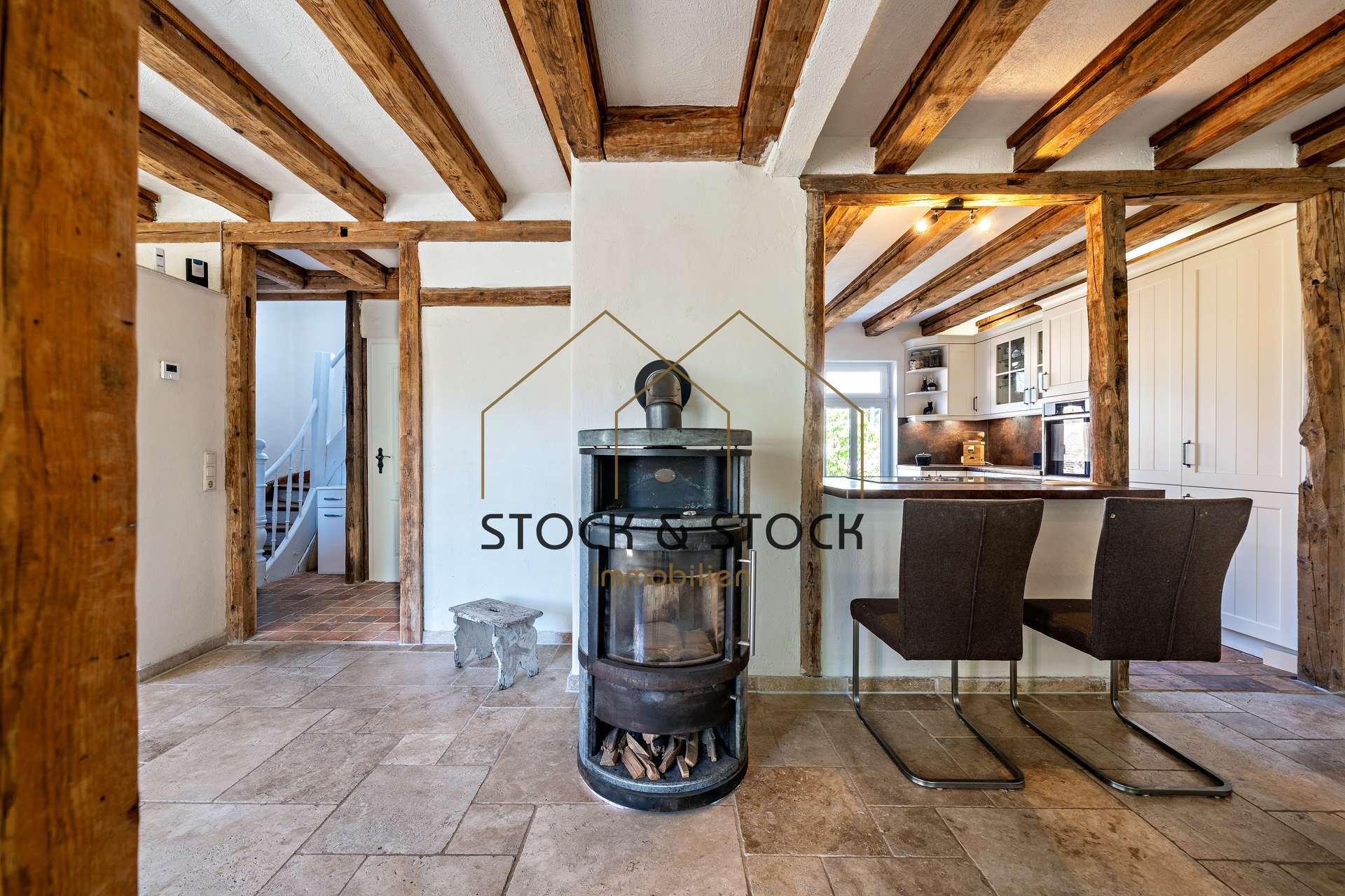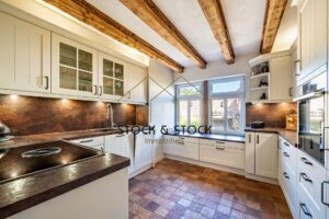 Das Herzstück des Hauses bildet das repräsentative Erdgeschoss: Hier lädt ein weitläufiges Wohn- und Esszimmer mit Kamin zum gemütlichen Beisammensein mit Familie und Freunden ein. Die zahlreichen doppelverglasten Schallschutzfenster sorgen für reichlich Tageslicht und verleihen dem Raum ein offenes Ambiente. Die gelungene Kombination aus antiken Fliesen, rustikalen Sichtbalken und hellen Wänden sorgen hier für ein ganz besonderes Wohngefühl. Die Wände wurden mit reinem Kalkputz und Kreidefarbe hergestellt. Die angrenzende, halb offene Küche im Landhausstil begeistert nicht nur durch ihre ansprechende Optik und den beträchtlichen Stauraum sondern auch durch den wunderschönen Ausblick in den romantischen Innenhof.