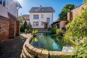Ein weiteres Highlight ist der romantische Aussenbereich des attraktiven Einfamilienhauses. Dieser sichtgeschützte, gepflasterte Innenhof mit seinem gepflegten Gartenteich lädt zum gemeinsamen Verweilen oder Spielen ein.